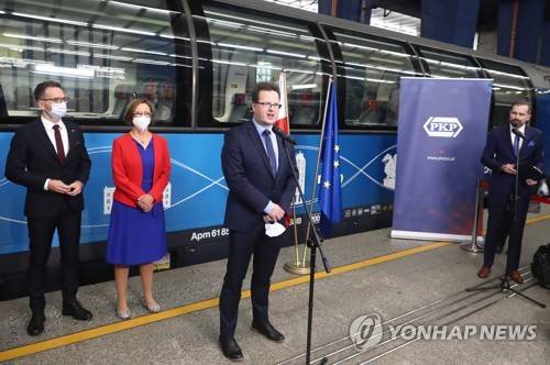 epa09477980 Secretary of State in Ministry of Development Funds and Regional Policy Waldemar Buda (L), Director for Waterborne Transport at the European Commission Magda Kopczynska (2L) and Secretary of State in Ministry of Infrastructure Andrzej Bittel (2R) during a press conference at the Warsaw Central railway station, in Warsaw, Poland, 20 September 2021. The event was organized to welcome to Poland the 'Connecting Europe Express' train, an EU initiative during which a special European train will stop in more than 100 towns and cities in 26 countries across Europe to promote the use of trains as safe and sustainable way of transportation. EPA/Tomasz Gzell POLAND OUT