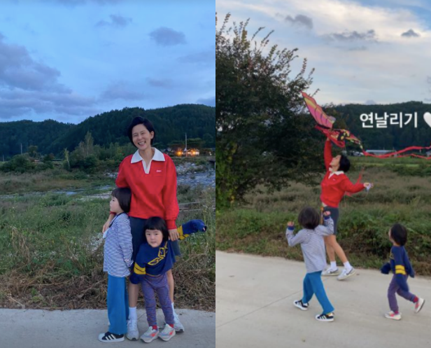 김나영은 자연을 느낄 수 있는 공간에서 아이들과 나란히 연 날리기를 즐기고 있는 모습.