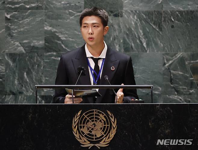 [뉴욕=AP/뉴시스] 그룹 BTS(방탄소년단)의 RM이 20일(현지시간) 미국 뉴욕 유엔본부 총회장에서 열린 제2차 SDG Moment(지속가능발전목표 고위급회의) 개회식에서 발언하고 있다. 2021.09.20.