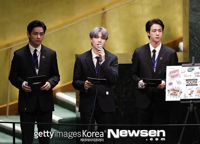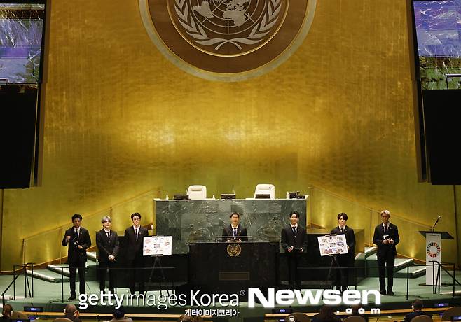 그룹 방탄소년단(RM, 진, 슈가, 제이홉, 지민, 뷔, 정국)의 유엔(UN) 총회 연설 현장 사진이 공개됐다.