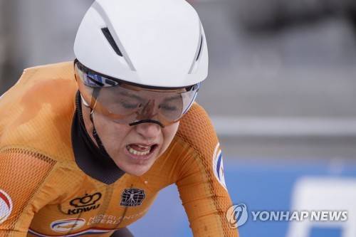 epa09478063 Annemiek van Vleuten of the Netherlands reacts while crossing the finish line during the women's Elite Individual Time Trial over 30.3km at the 2021 Road Cycling World Championships in Bruges, Belgium, 20 September 2021. EPA/OLIVIER HOSLET