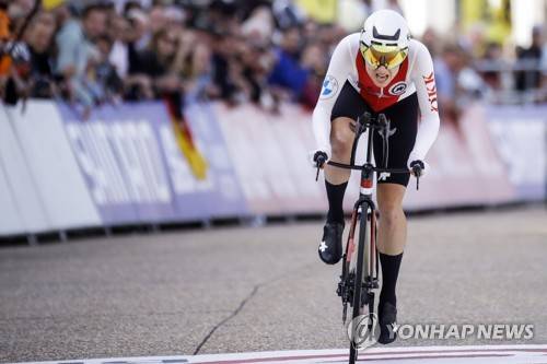 epa09478075 Marlen Reusser of Switzerland crosses the finish line during the women's Elite Individual Time Trial over 30.3km at the 2021 Road Cycling World Championships in Bruges, Belgium, 20 September 2021. EPA/OLIVIER HOSLET