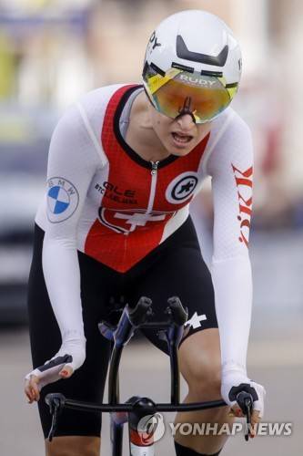 epa09478078 Marlen Reusser of Switzerland reacts while crossing the finish line during the women's Elite Individual Time Trial over 30.3km at the 2021 Road Cycling World Championships in Bruges, Belgium, 20 September 2021. EPA/OLIVIER HOSLET