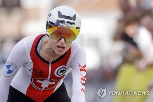 epa09478081 Marlen Reusser of Switzerland reacts while crossing the finish line during the women's Elite Individual Time Trial over 30.3km at the 2021 Road Cycling World Championships in Bruges, Belgium, 20 September 2021. EPA/OLIVIER HOSLET