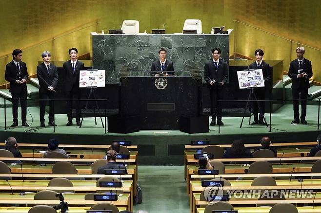 (뉴욕=연합뉴스) 최재구 기자 = 그룹 BTS(방탄소년단)이 20일(현지시각) 뉴욕 유엔본부 총회장에서 열린 제2차 SDG Moment(지속가능발전목표 고위급회의) 개회식에서 발언하고 있다. 왼쪽부터 뷔, 슈가, 진, RM, 정국, 지민, 제이홉. 2021.9.20