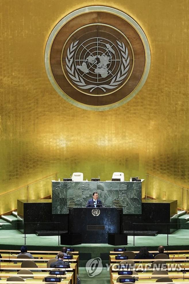 (뉴욕=연합뉴스) 최재구 기자 = 문재인 대통령이 20일(현지시각) 뉴욕 유엔본부 총회장에서 열린 제2차 SDG Moment(지속가능발전목표 고위급회의) 개회식에서 발언하고 있다. 2021.9.20