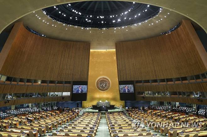 (뉴욕=연합뉴스) 최재구 기자 = 문재인 대통령이 20일(현지시각) 뉴욕 유엔본부 총회장에서 열린 제2차 SDG Moment(지속가능발전목표 고위급회의) 개회식에서 발언하고 있다. 2021.9.20