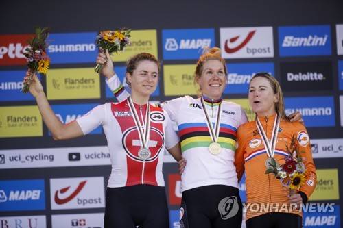 epa09478128 Ellen van Dijk (C) of the Netherlands celebrates on the podium after winning the women's Elite Individual Time Trial over 30.3km at the 2021 Road Cycling World Championships in Bruges, Belgium, 20 September 2021. Van Dijk won ahead of second placed Marlen Reusser (L) of Switzerland and third placed Annemiek van Vleuten (R) of the Netherlands. EPA/OLIVIER HOSLET