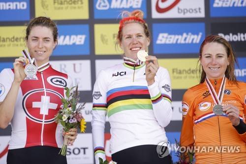 epa09478135 Ellen van Dijk (C) of the Netherlands poses with her gold medal on the podium after winning the women's Elite Individual Time Trial over 30.3km at the 2021 Road Cycling World Championships in Bruges, Belgium, 20 September 2021. Van Dijk won ahead of second placed Marlen Reusser (L) of Switzerland and third placed Annemiek van Vleuten (R) of the Netherlands. EPA/OLIVIER HOSLET