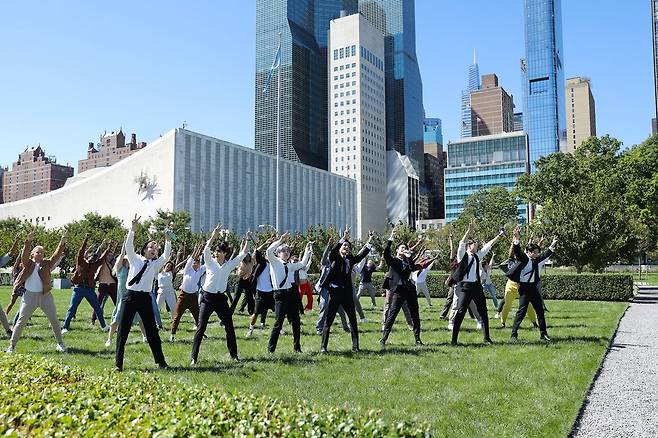 유엔 배경으로 '퍼미션 투 댄스' 군무 펼치는 BTS와 댄서들