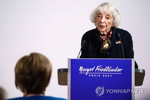 epa09478144 Holocaust survivor Margot Friedlaender delivers a speech during the awarding ceremony of the Margot Friedlaender Award in Berlin, Germany, 20 September 2021. The Margot Friedlaender Award is awarded to young people to engage with the Holocaust. EPA/CLEMENS BILAN / POOL