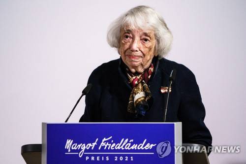 epa09478146 Holocaust survivor Margot Friedlaender delivers a speech during the awarding ceremony of the Margot Friedlaender Award in Berlin, Germany, 20 September 2021. The Margot Friedlaender Award is awarded to young people to engage with the Holocaust. EPA/CLEMENS BILAN / POOL