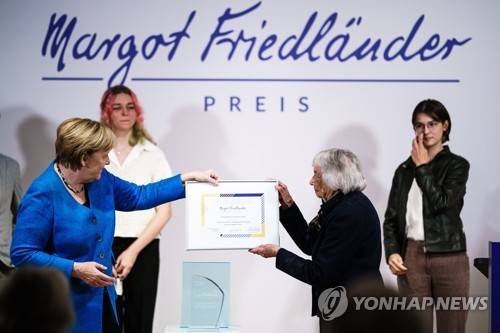 epa09478148 German Chancellor Angela Merkel (L) and Holocaust survivor Margot Friedlaender hold one of the award certificates during the awarding ceremony of the Margot Friedlaender Award in Berlin, Germany, 20 September 2021. The Margot Friedlaender Award is awarded to young people to engage with the Holocaust. EPA/CLEMENS BILAN / POOL
