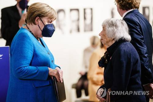 epa09478158 German Chancellor Angela Merkel (L) and Holocaust survivor Margot Friedlaender talk after the awarding ceremony of the Margot Friedlaender Award in Berlin, Germany, 20 September 2021. The Margot Friedlaender Award is awarded to young people to engage with the Holocaust. EPA/CLEMENS BILAN / POOL