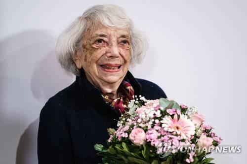 epa09478162 Holocaust survivor Margot Friedlaender receives flowers after the awarding ceremony of the Margot Friedlaender Award in Berlin, Germany, 20 September 2021. The Margot Friedlaender Award is awarded to young people to engage with the Holocaust. EPA/CLEMENS BILAN / POOL