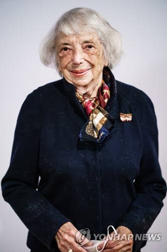 epa09478161 Holocaust survivor Margot Friedlaender poses for media after the awarding ceremony of the Margot Friedlaender Award in Berlin, Germany, 20 September 2021. The Margot Friedlaender Award is awarded to young people to engage with the Holocaust. EPA/CLEMENS BILAN / POOL