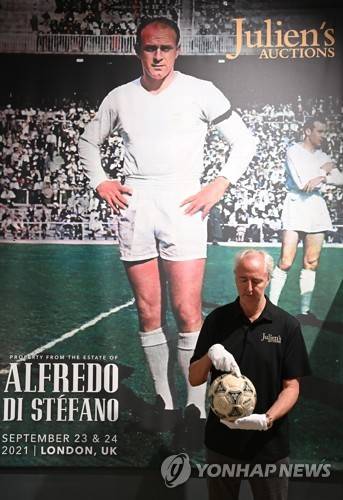 epa09478243 A Julien's Auctions employee poses for photographers with a 1990 Italy FIFA World Cup official football with signatures from the estate of Argentina soccer legend Alfredo Di Stefano at the Mall Galleries in London, Britain, 20 September 2021. The collection from the estate of Alfredo Di Stefano that will go under the hammer at auction on 23-24 September in London includes medals, trophies, jerseys, awards, and personal items. EPA/FACUNDO ARRIZABALAGA