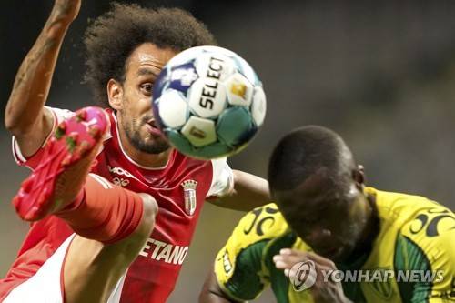 epa09478449 SC Braga's Fabio Martins (L) in action against Tondela's Jaquite (R) during the Portuguese First League soccer match between SC Braga and Tondela at Municipal de Braga stadium in Braga, Portugal, 20 September 2021. EPA/HUGO DELGADO