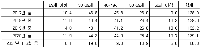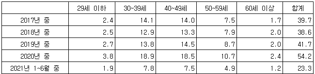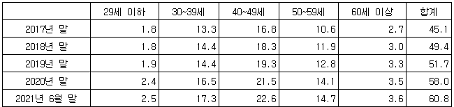 연령별로는 30대가 7조8천억원으로 가장 많았고 40대가 7조5천억원으로 뒤를 이었다. 이어 50대 4조9천억원, 20대 이하 1조9천억원, 60대 이상 1조2천억원 순이었다.