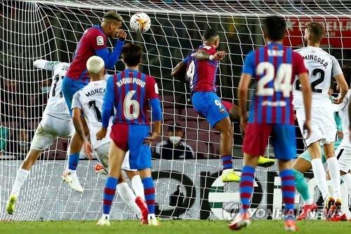 epa09478451 Barcelona's defender Ronald Araujo (2-L) scores the 1-1 goal during the Spanish LaLiga soccer match between FC Barcelona and Granada CF held at Camp Nou stadium, in Barcelona, Spain, 20 September 2021. EPA/Enric Fontcuberta