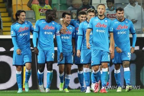 epa09478453 Napoli?s Hirving Lozano (3-L) celebrates with teammates after scoring the 0-4 goal in the Italian Serie A soccer match between Udinese Calcio and SSC Napoli at the Friuli-Dacia Arena stadium in Udine, Italy, 20 September 2021. EPA/GABRIELE MENIS