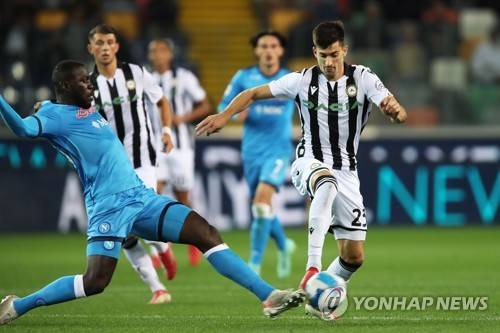 epa09478454 Udinese's Ignacio Pussetto (R) and Napoli's Kalidou Koulibaly in action during the Italian Serie A soccer match between Udinese Calcio and SSC Napoli at the Friuli-Dacia Arena stadium in Udine, Italy, 20 September 2021. EPA/GABRIELE MENIS
