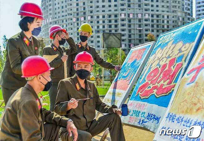 (평양 노동신문=뉴스1) = 북한 노동당 기관지 노동신문은 21일 "힘있는 화선식 정치 사업으로 기적 창조의 불길을 지펴올린다"면서 관련 사진을 실었다. 선전선동에 활용되는 포스터를 제작 중인 모습.