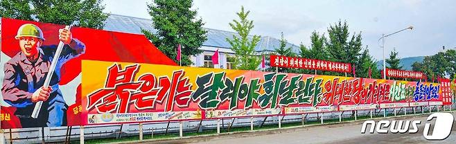 (평양 노동신문=뉴스1) = 북한 노동당 기관지 노동신문은 21일 "힘있는 화선식 정치 사업으로 기적 창조의 불길을 지펴올린다"면서 관련 사진을 실었다. 거리에 설치된 선전선동 문구판.