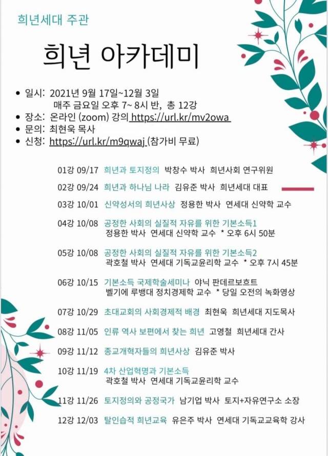 연세대 선교단체 희년세대(대표 김유준 목사)는 지난 17일 시작한 희년 아카데미 가을학기를 12월까지 매주 진행할 예정이라고 밝혔다. 희년세대는 토지 공개념, 부채 탕감, 기본소득 등 성경적 토지 정의를 청년 세대에게 알리기 위해 2017년 연세대 캠퍼스에서 만들어진 학원선교단체다.