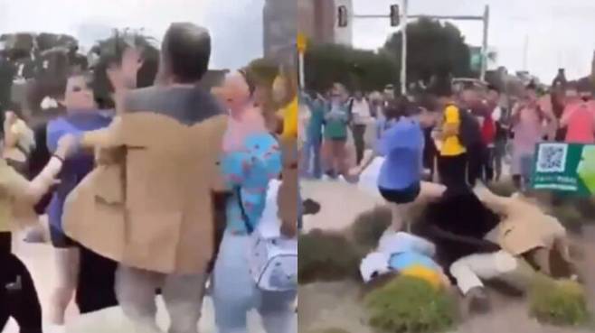 목격자가 공개한 영상에는 한 여학생이 팻말을 든 남성의 짐을 뺏은 뒤 주먹으로 그의 얼굴을 때려 땅에 쓰러뜨리는 모습이 담겼습니다. 주변에 있던 학생들은 깜짝 놀라며 소리를 지르거나 크게 환호했습니다.