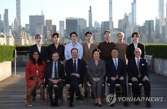 (뉴욕=연합뉴스) 최재구 기자 = 문재인 대통령과 UN총회 참석차 뉴욕을 방문한 김정숙 여사가 20일(현지시간) 메트로폴리탄 미술관에서 미래문화특사인 그룹 BTS(방탄소년단) 및 참석자와 기념촬영을 하고 있다. 2021.9.21