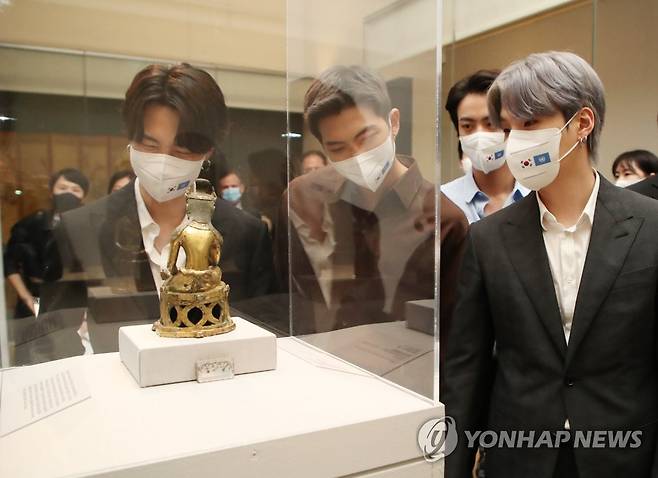 (뉴욕=연합뉴스) 최재구 기자 = 미래문화특사인 그룹 BTS(방탄소년단)가 20일(현지시각) 메트로폴리탄 미술관에서 한국실을 관람하고 있다. 2021.9.21