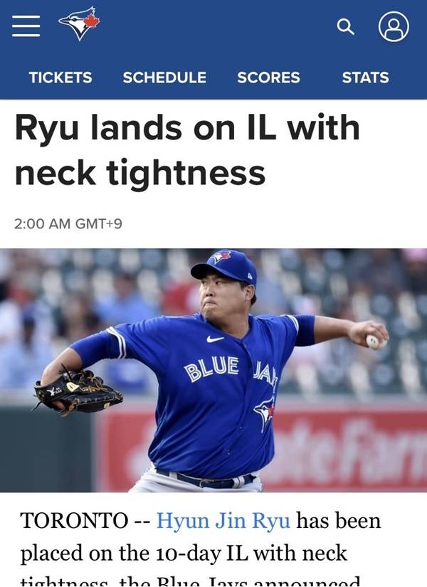류현진은 LA 다저스에서 뛰던 2019년에도 가벼운 목 통증으로 부상자 명단에 올랐다가 10일 만에 복귀한 바 있다.