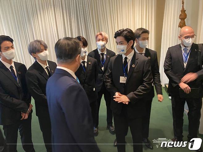 (서울=뉴스1) = 문재인 대통령이 20일(현지시간) 뉴욕 유엔본부에서 열린 제76차 유엔 총회 SDG Moment(지속가능발전목표 고위급회의) 개회 세션에서 그룹 방탄소년단(BTS)과 이야기를 나누고 있다. (청와대 페이스북) 2021.9.21/뉴스1