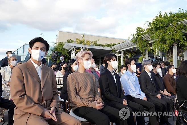 (뉴욕=연합뉴스) 최재구 기자 = 미래문화특사인 그룹 BTS(방탄소년단)가 20일(현지시각) 메트로폴리탄 미술관에서 김정숙 여사의 방문 인사말을 듣고 있다. 2021.9.21
