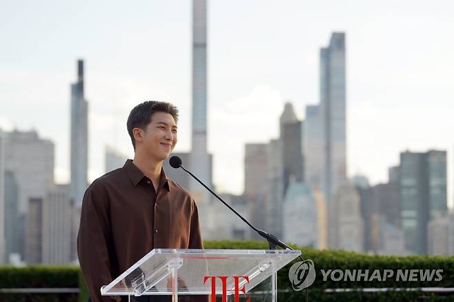 (뉴욕=연합뉴스) 최재구 기자 = 미래문화특사인 그룹 BTS(방탄소년단) RM이 20일(현지시각) 메트로폴리탄 미술관에서 방문 인사말을 하고 있다. 2021.9.21