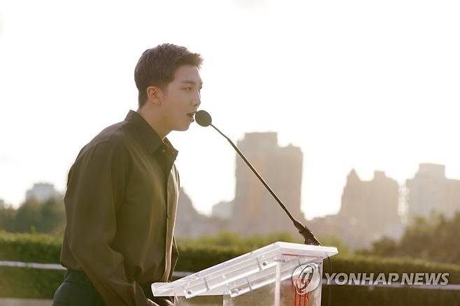 (뉴욕=연합뉴스) 최재구 기자 = 미래문화특사인 그룹 BTS(방탄소년단) RM이 20일(현지시각) 메트로폴리탄 미술관에서 방문 인사말을 하고 있다. 2021.9.21