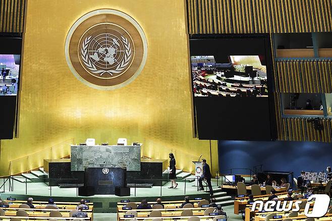 (서울=뉴스1) = 문재인 대통령이 20일(현지시간) 뉴욕 유엔본부에서 열린 제76차 유엔 총회 SDG Moment(지속가능발전목표 고위급회의) 개회 세션에서 발언을 위해 연단에 오르고 있다. (청와대 제공) 2021.9.21/뉴스1