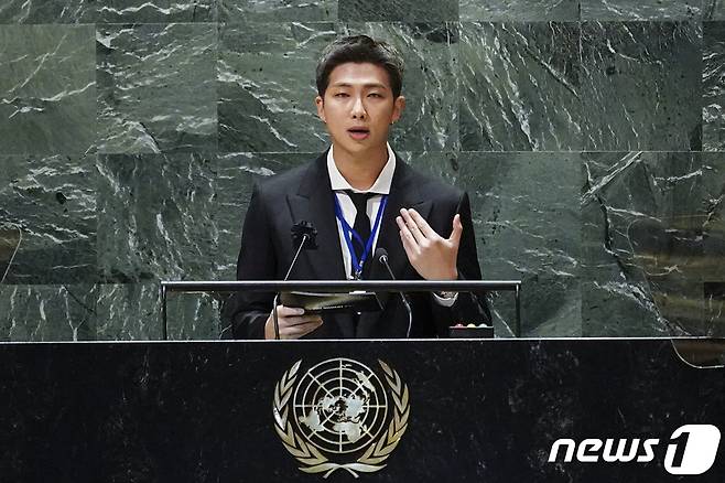 (서울=뉴스1) = 그룹 방탄소년단(BTS) RM이 20일(현지시간) 뉴욕 유엔본부에서 열린 제76차 유엔 총회 SDG Moment(지속가능발전목표 고위급회의) 개회 세션에서 발언하고 있다. (청와대 제공) 2021.9.21/뉴스1