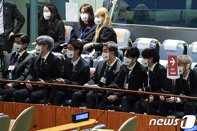 (서울=뉴스1) = 그룹 방탄소년단(BTS)이 20일(현지시간) 뉴욕 유엔본부에서 열린 제76차 유엔 총회 SDG Moment(지속가능발전목표 고위급회의) 개회 세션에서 문재인 대통령의 발언을 경청하고 있다. (청와대 제공) 2021.9.21/뉴스1