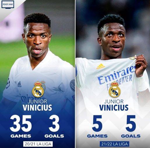 2018/2019시즌 레알 합류 이후 최고 기록이다. 비니시우스는 2019/2020시즌 리그 29경기에 나서 3골, 지난 시즌에는 35경기에 출전해 3골을 넣는 데 그쳤다. 스피드와 발재간은 훌륭했으나 결정력이 아쉬웠다. 새 시즌에는 약점으로 꼽히던 결정력이 완전히 보완된 모습이다.