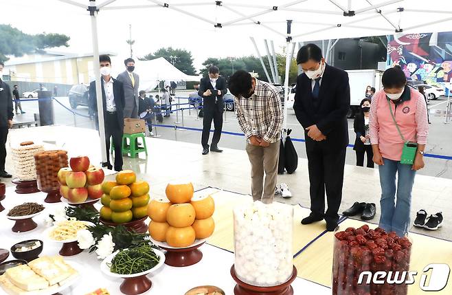 (파주=뉴스1) 임세영 기자 = 황교안 국민의힘 대선 경선 예비후보가 추석인 21일 오전 경기도 파주 임진각 망배단에서 차례상에 절을 하고 있다. 2021.9.21/뉴스1