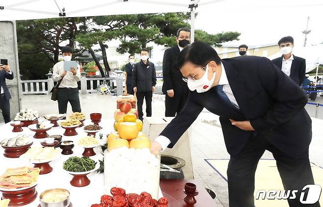(파주=뉴스1) 임세영 기자 = 황교안 국민의힘 대선 경선 예비후보가 추석인 21일 오전 경기도 파주 임진각 망배단에서 차례상에 절을 하고 있다. 2021.9.21/뉴스1