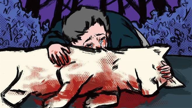 폐를 관통당한 산돌이는 내 품 안에서 파들파들 떨며 피를 쏟았다. 탄환이 관통한 가슴의 양쪽을 손바닥으로 막아 보았지만 아무 소용도 없었다. 새하얀 산돌이의 털을 붉게 물들인 피가 내 무릎을 흥건히 적시며 흘러내렸다. 심장이 멈추고, 나를 바라보던 산돌이의 눈이 스르르 감겼다.