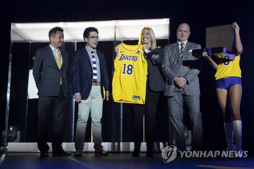 epa09478603 (L-R) Wookho Kyeong, CMO of CJ CheilJedang; Sun-Ho Lee, Bibigo Head of Global Business Planning; Jeanie Buss, Lakers Governor and Tim Harris, Lakers President of Business Operations, present the new 2021-2022 season Los Angeles Lakers uniform with the Bibigo logo after the announcement of a new corporate sponsorship with the company at an event at the UCLA Health Training Center in El Segundo, California, USA, 20 September 2021. Bibigo is a Korean cuisine brand. EPA/CAROLINE BREHMAN