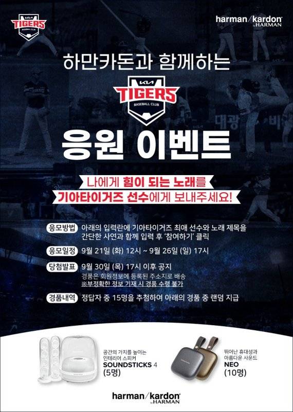 특히 9월에는 추석 연휴 포함 21일~26일까지 하만카돈 브랜드와 함께하는 랜선 응원 이벤트 '나에게 힘이 되는 노래를 KIA타이거즈 선수들에게 보내주세요'를 진행한다. KIA타이거즈 공식 멤버십 앱에서 선수들에게 응원 노래를 추천하는 팬들에게 추첨을 통해 하만카돈 블루투스 스피커 '사운드스틱 4(SOUNDSTICKS 4)'와 '네오(NEO)'를 경품으로 증정한다. 당첨자 확인은 9월 30일 오후 5시 이후 KIA타이거즈 공식 멤버십 앱에서 가능하다.