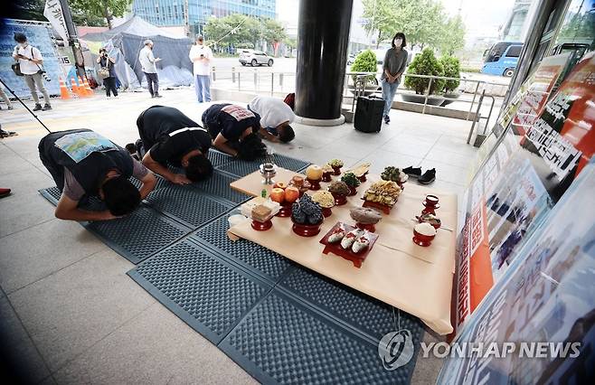 (서울=연합뉴스) 김인철 기자 = 추석인 21일 서울고용노동청 앞에서 아시아나케이오 해고 노동자와 공공운수노조 등 조합원들이 거리의 한가위 차례 지내기를 하고 있다. 2021.9.21