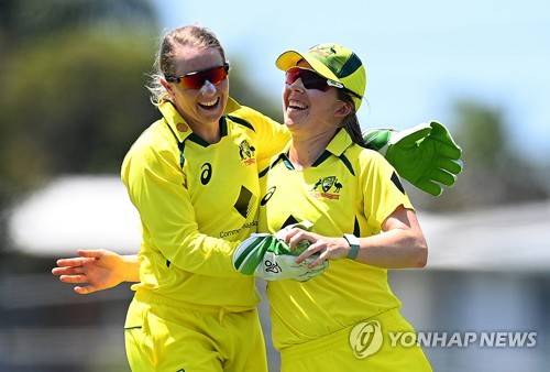 epa09478613 Alyssa Healy (L) and Georgia Wareham (R) of Australia react after the dismissal of India batsman Deepti Sharm for 9 runs on Day 1 of the Women’s First One Day International (ODI) match between Australia and India at Great Barrier Reef Stadium in Mackay, Australia, 21 September 2021. EPA/DAVE HUNT IMAGES TO BE USED FOR NEWS REPORTING PURPOSES ONLY, NO COMMERCIAL USE WHATSOEVER, NO USE IN BOOKS WITHOUT PRIOR WRITTEN CONSENT FROM AAP AUSTRALIA AND NEW ZEALAND OUT
