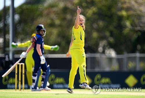 epa09478611 Australian bowler Darcie Brown reacts after dismissing Indian batsman Shafali Verma for 8 runs on Day 1 of the Women’s First One Day International (ODI) match between Australia and India at Great Barrier Reef Stadium in Mackay, Australia, 21 September 2021. EPA/DAVE HUNT IMAGES TO BE USED FOR NEWS REPORTING PURPOSES ONLY, NO COMMERCIAL USE WHATSOEVER, NO USE IN BOOKS WITHOUT PRIOR WRITTEN CONSENT FROM AAP AUSTRALIA AND NEW ZEALAND OUT
