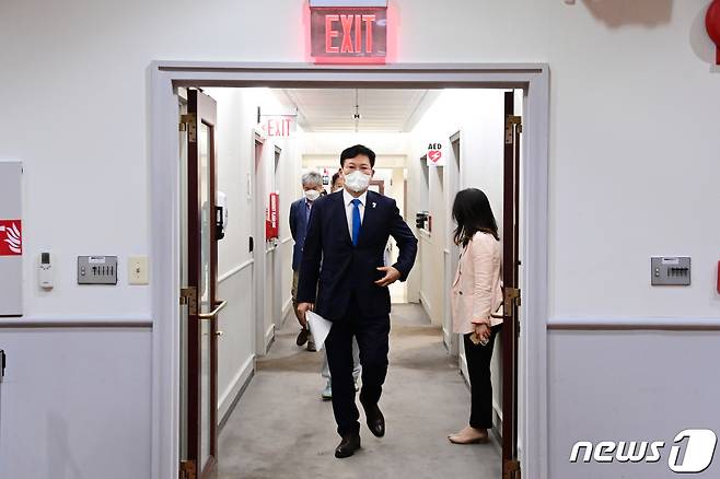 (서울=뉴스1) = 송영길 더불어민주당 대표를 비롯한 방미단이 20일(현지시간) 미국 워싱턴 주미한국대사관에서 NBC 화상인터뷰를 위해 이동하고 있다. (더불어민주당 제공) 2021.9.21/뉴스1